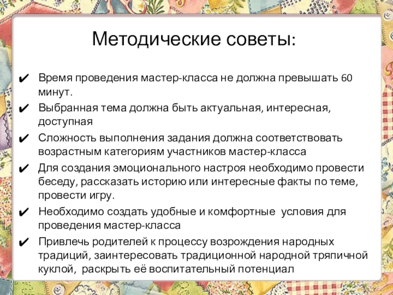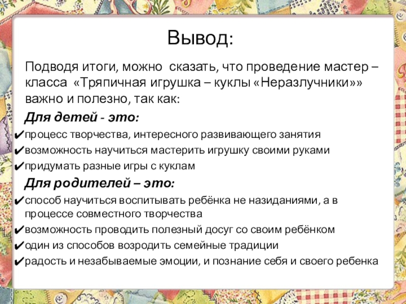 Подводя итоги, можно сказать, что проведение мастер – класса «Тряпичная игрушка