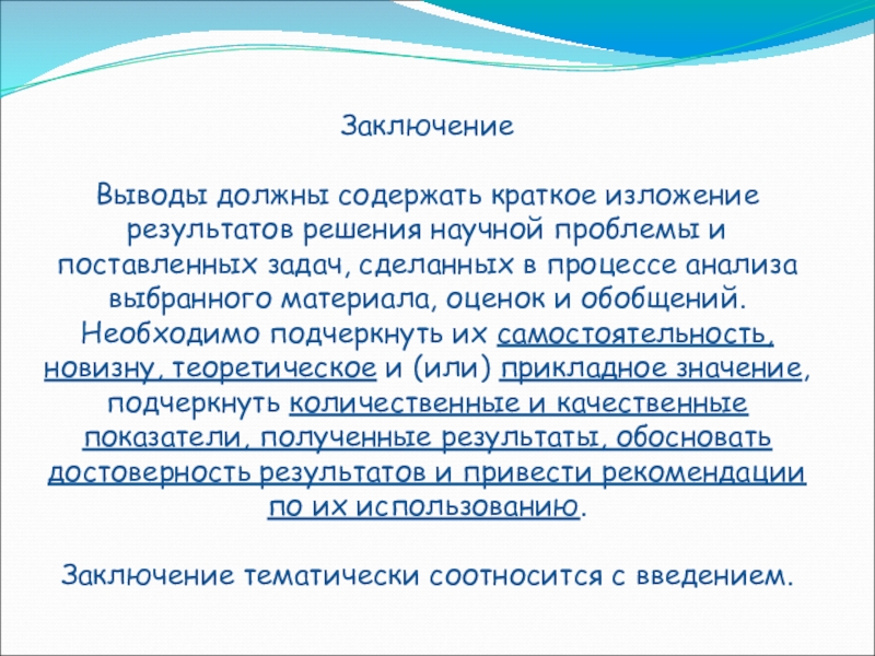 задач, сделанных в процессе анализа выбранного материала, оценок и обобщений. Необходимо подчеркнуть их самостоятельность, новизну, теоретическое и (или) прикладное значение, подчеркнуть количественные и качественные показатели, полученные результаты, обосновать достоверность результатов и привести рекомендации по их использованию.