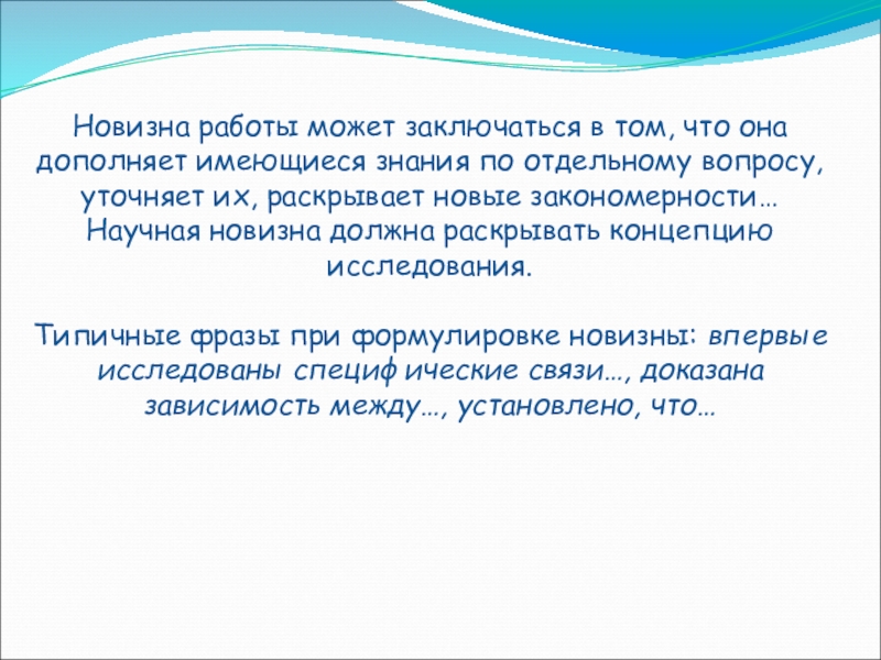 Типичные фразы при формулировке новизны: впервые исследованы специфические связи…, доказана зависимость между…, установлено, что…