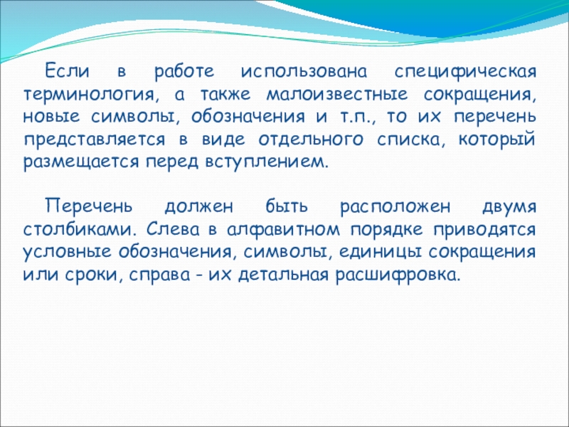 Перечень должен быть расположен двумя столбиками. Слева в алфавитном порядке приводятся условные обозначения, символы, единицы сокращения или сроки, справа - их детальная расшифровка.