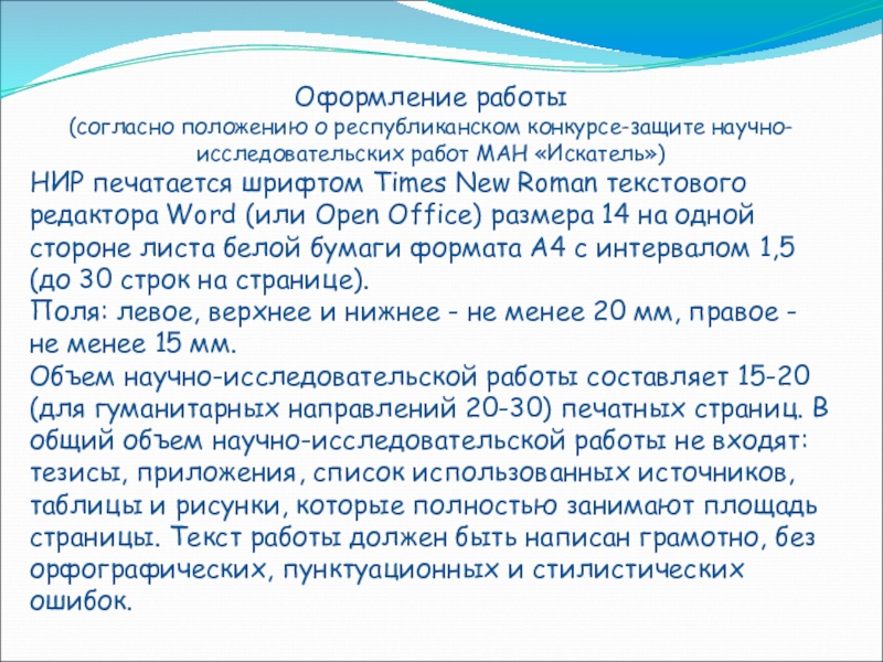 Объем научно-исследовательской работы составляет 15-20 (для гуманитарных направлений 20-30) печатных страниц. В общий объем научно-исследовательской работы не входят: тезисы, приложения, список использованных источников, таблицы и рисунки, которые полностью занимают площадь страницы. Текст работы должен быть написан грамотно, без орфографических, пунктуационных и стилистических ошибок.