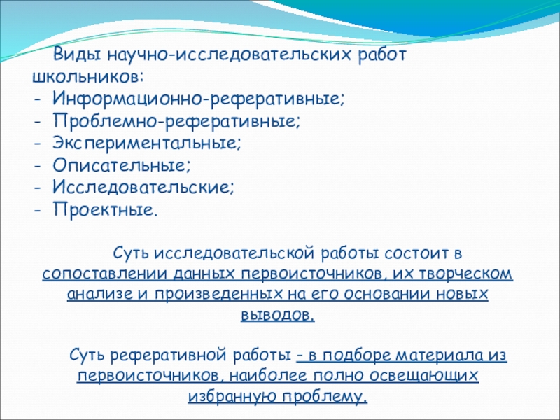 Суть реферативной работы - в подборе материала из первоисточников, наиболее полно освещающих избранную проблему.