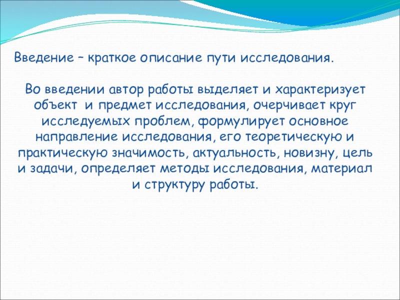 характеризует объект и предмет исследования, очерчивает круг исследуемых проблем, формулирует основное направление исследования, его теоретическую и практическую значимость, актуальность, новизну, цель и задачи, определяет методы исследования, материал и структуру работы.