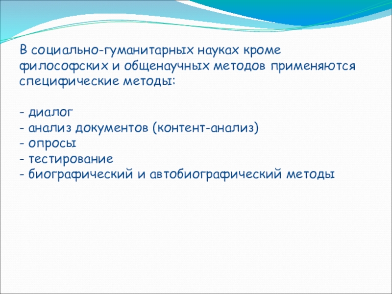 Слайд 11В социально-гуманитарных науках кроме философских и общенаучных методов применяются специфические методы: