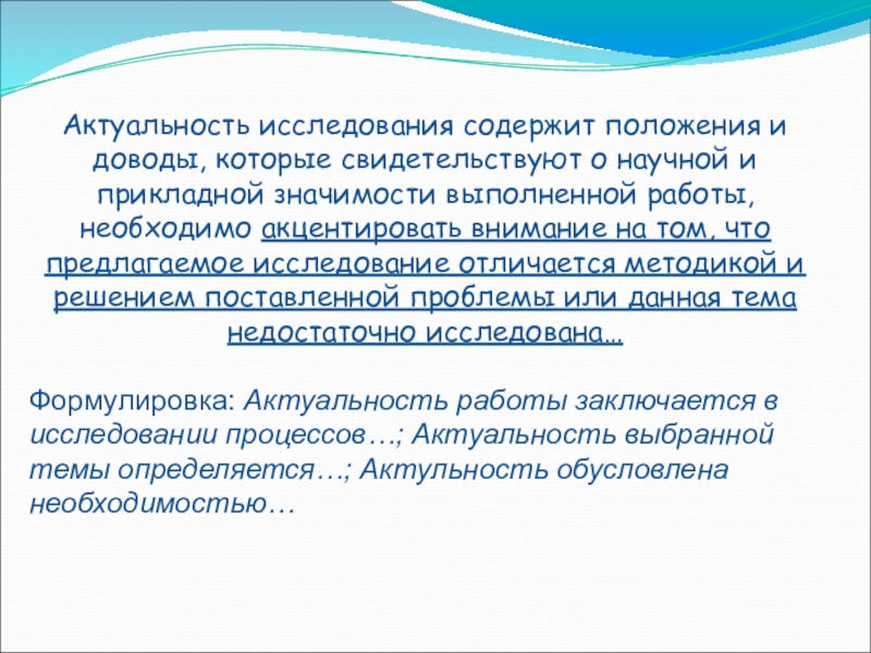 Формулировка: Актуальность работы заключается в исследовании процессов…; Актуальность выбранной темы определяется…; Актульность обусловлена необходимостью…