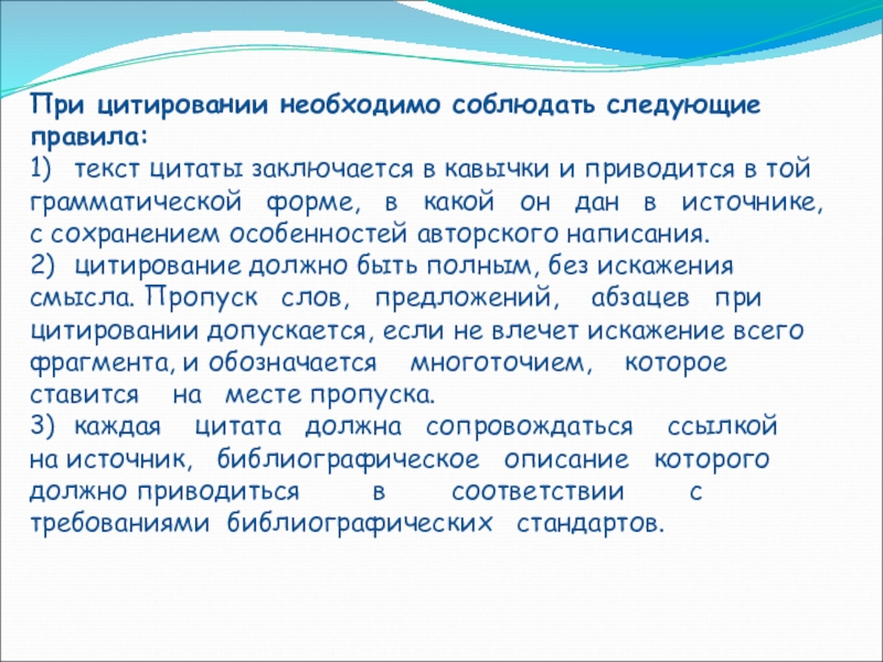3) каждая цитата должна сопровождаться ссылкой на источник, библиографическое описание которого должно приводиться в соответствии с требованиями библиографических стандартов.