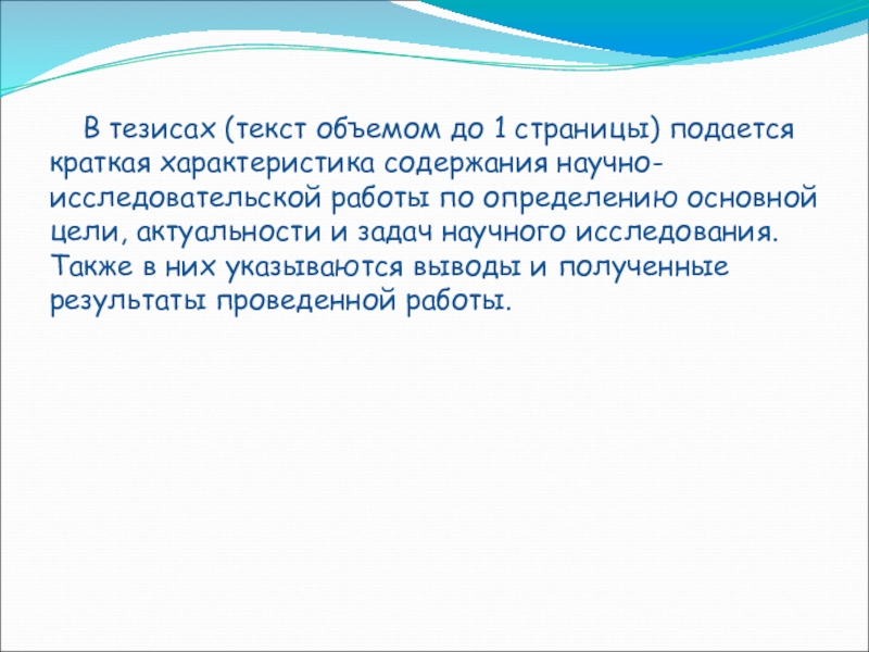 В тезисах (текст объемом до 1 страницы) подается краткая характеристика содержания