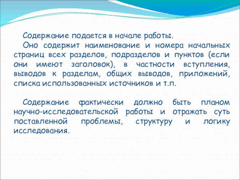 Содержание фактически должно быть планом научно-исследовательской работы и отражать суть поставленной проблемы, структуру и логику исследования.