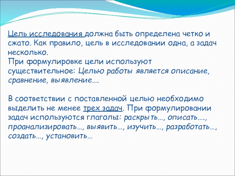 Цель исследования должна быть определена четко и сжато. Как правило, цель