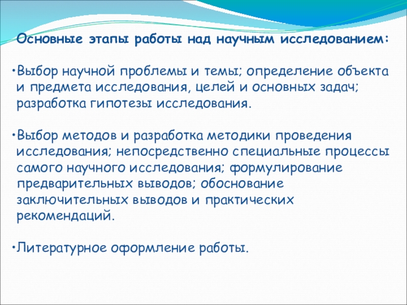 Выбор методов и разработка методики проведения исследования; непосредственно специальные процессы самого научного исследования; формулирование предварительных выводов; обоснование заключительных выводов и практических рекомендаций.