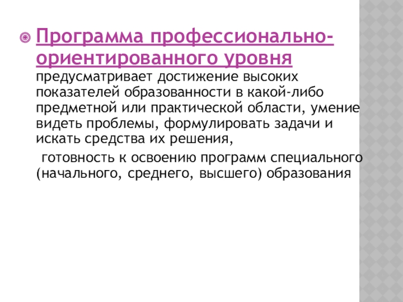 Слайд 10Программа профессионально-ориентированного уровня предусматривает достижение высоких показателей образованности в какой-либо предметной