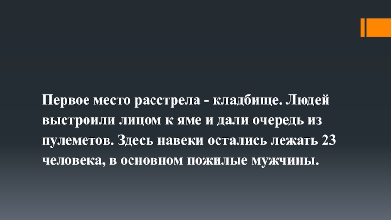 Слайд 7Первое место расстрела - кладбище. Людей выстроили лицом к яме и