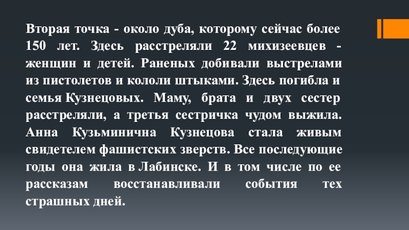 расстреляли 22 михизеевцев - женщин и детей. Раненых добивали выстрелами из пистолетов и кололи штыками. Здесь погибла и семья Кузнецовых. Маму, брата и двух сестер расстреляли, а третья сестричка чудом выжила. Анна Кузьминична Кузнецова стала живым свидетелем фашистских зверств. Все последующие годы она жила в Лабинске. И в том числе по ее рассказам восстанавливали события тех страшных дней.
