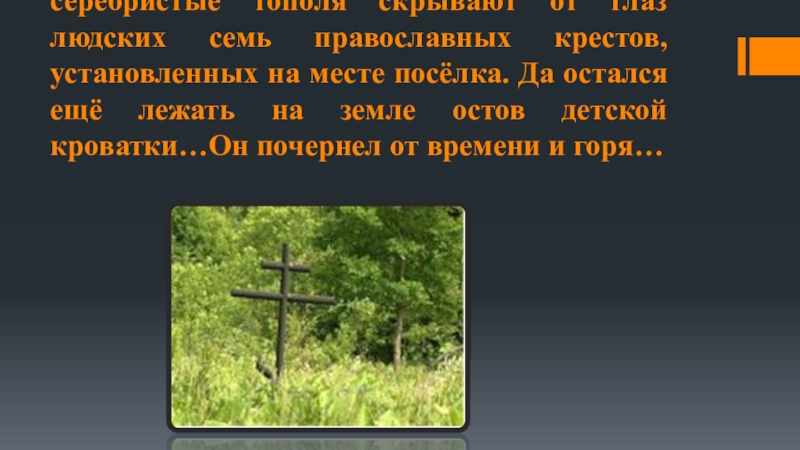 да серебристые тополя скрывают от глаз людских семь православных крестов, установленных на месте посёлка. Да остался ещё лежать на земле остов детской кроватки…Он почернел от времени и горя…