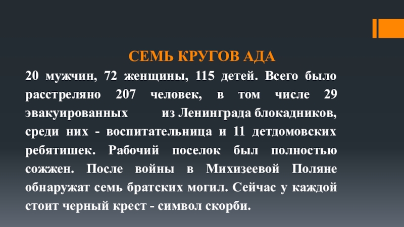207 человек, в том числе 29 эвакуированных из Ленинграда блокадников, среди них - воспитательница и 11 детдомовских ребятишек. Рабочий поселок был полностью сожжен. После войны в Михизеевой Поляне обнаружат семь братских могил. Сейчас у каждой стоит черный крест - символ скорби.