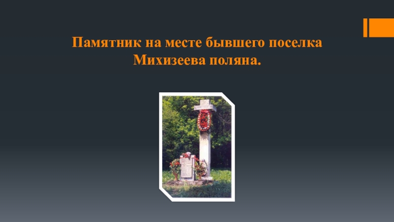 Слайд 18Памятник на месте бывшего поселка Михизеева поляна.