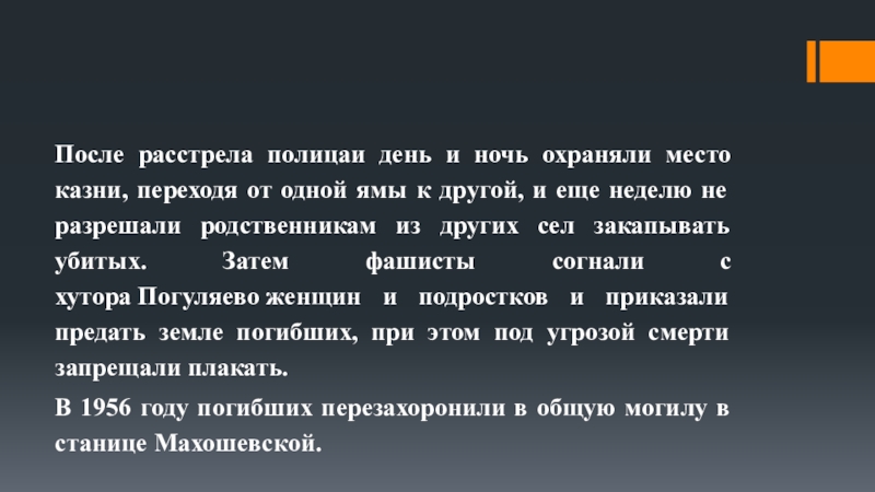 Слайд 14После расстрела полицаи день и ночь охраняли место казни, переходя от
