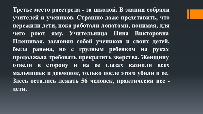 учеников. Страшно даже представить, что пережили дети, пока работали лопатами, понимая, для чего роют яму. Учительница Нина Викторовна Плешивая, заслоняя собой учеников и своих детей, была ранена, но с грудным ребенком на руках продолжала требовать прекратить зверства. Женщину отвели в сторону и на ее глазах казнили всех мальчишек и девчонок, только после этого убили и ее. Здесь остались лежать 56 человек, практически все - дети.