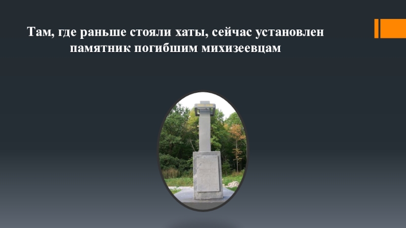 Слайд 15Там, где раньше стояли хаты, сейчас установлен памятник погибшим михизеевцам