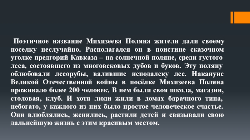 он в поистине сказочном уголке предгорий Кавказа – на солнечной поляне, среди густого леса, состоявшего из многовековых дубов и буков. Эту поляну облюбовали лесорубы, валившие неподалеку лес. Накануне Великой Отечественной войны в посёлке Михизеева Поляна проживало более 200 человек. В нем были своя школа, магазин, столовая, клуб. И хотя люди жили в домах барачного типа, небогато, у каждого из них было простое человеческое счастье. Они влюблялись, женились, растили детей и связывали свою дальнейшую жизнь с этим красивым местом.