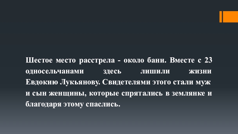 Слайд 12Шестое место расстрела - около бани. Вместе с 23 односельчанами здесь