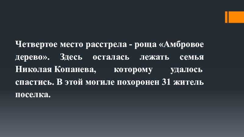 Слайд 10Четвертое место расстрела - роща «Амбровое дерево». Здесь осталась лежать семья