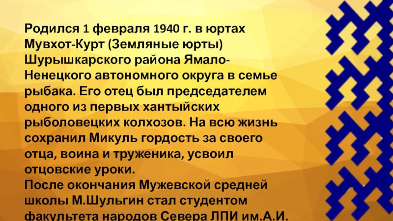 Слайд 2Родился 1 февраля 1940 г. в юртах Мувхот-Курт (Земляные юрты) Шурышкарского