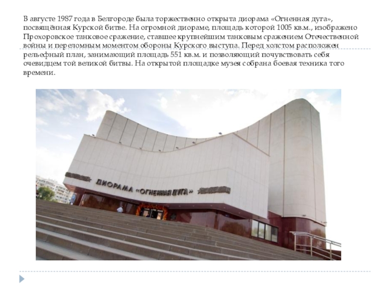 Слайд 13В августе 1987 года в Белгороде была торжественно открыта диорама «Огненная
