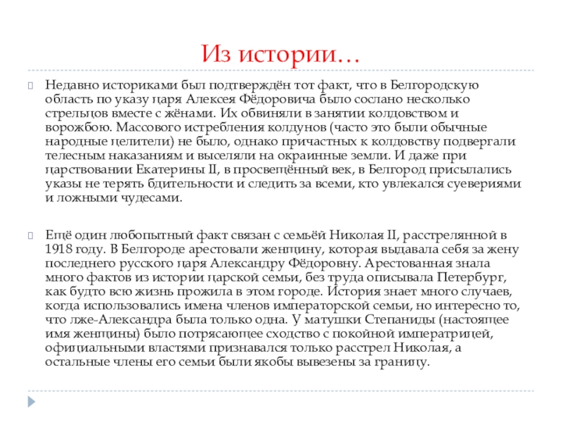 по указу царя Алексея Фёдоровича было сослано несколько стрельцов вместе с жёнами. Их обвиняли в занятии колдовством и ворожбою. Массового истребления колдунов (часто это были обычные народные целители) не было, однако причастных к колдовству подвергали телесным наказаниям и выселяли на окраинные земли. И даже при царствовании Екатерины II, в просвещённый век, в Белгород присылались указы не терять бдительности и следить за всеми, кто увлекался суевериями и ложными чудесами.