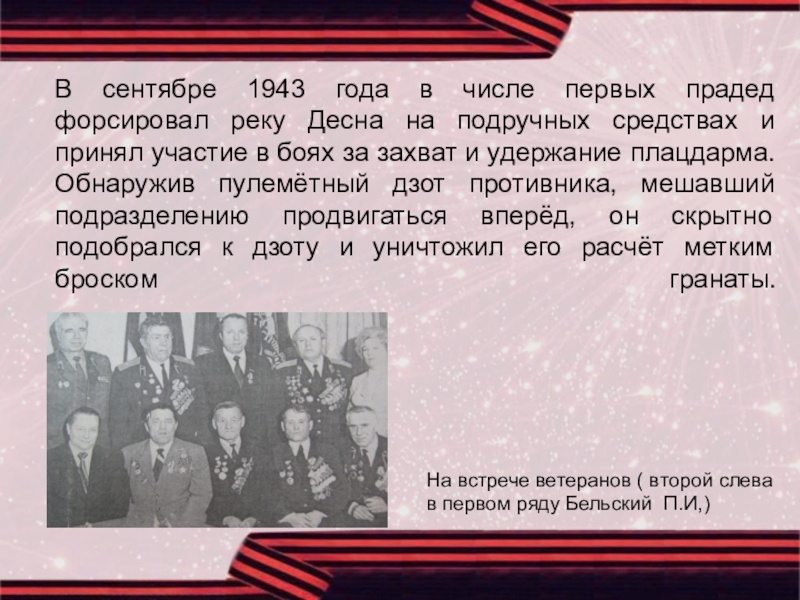 Слайд 10В сентябре 1943 года в числе первых прадед форсировал реку Десна