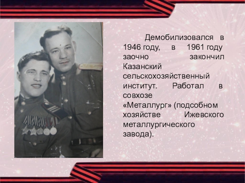 Слайд 21 Демобилизовался в 1946 году, в 1961 году заочно закончил Казанский сельскохозяйственный