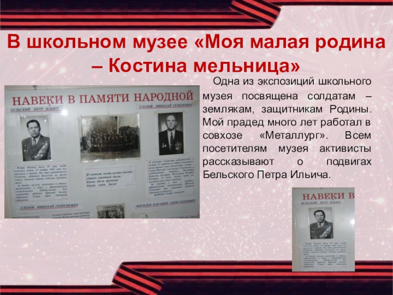 экспозиций школьного музея посвящена солдатам – землякам, защитникам Родины. Мой прадед много лет работал в совхозе «Металлург». Всем посетителям музея активисты рассказывают о подвигах Бельского Петра Ильича.