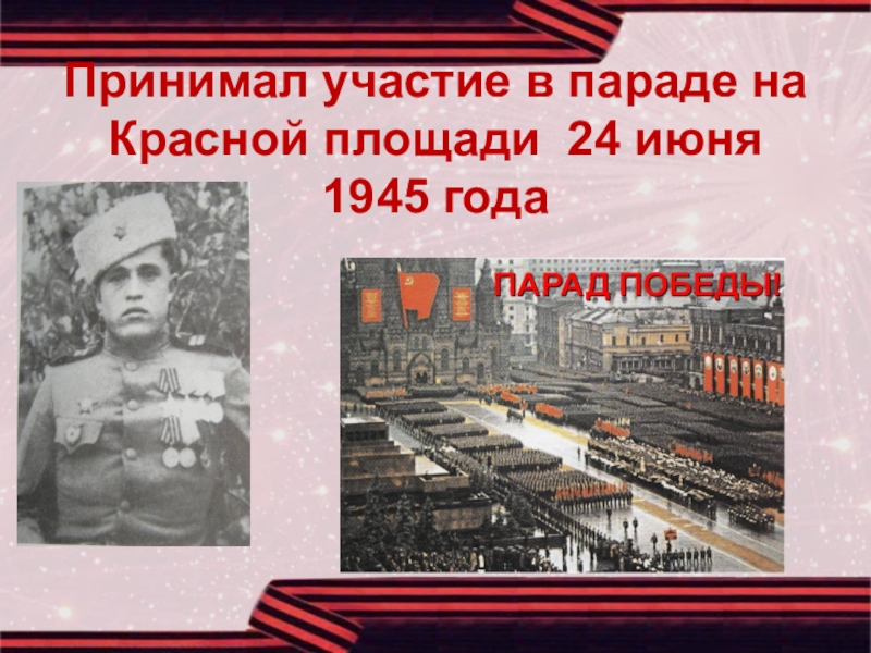 Слайд 20Принимал участие в параде на Красной площади 24 июня