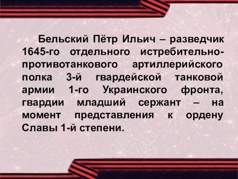 Слайд 14 Бельский Пётр Ильич – разведчик 1645-го отдельного истребительно-противотанкового артиллерийского