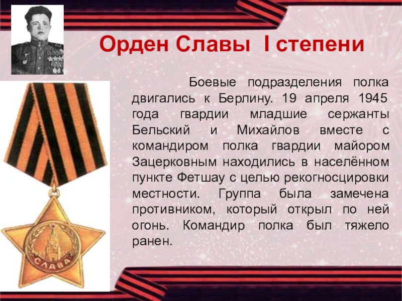 к Берлину. 19 апреля 1945 года гвардии младшие сержанты Бельский и Михайлов вместе с командиром полка гвардии майором Зацерковным находились в населённом пункте Фетшау с целью рекогносцировки местности. Группа была замечена противником, который открыл по ней огонь. Командир полка был тяжело ранен.