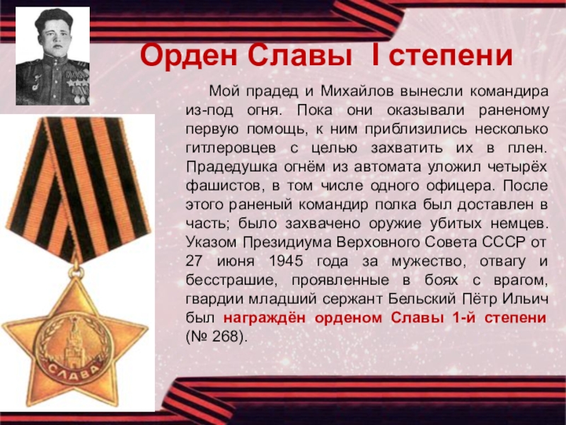 вынесли командира из-под огня. Пока они оказывали раненому первую помощь, к ним приблизились несколько гитлеровцев с целью захватить их в плен. Прадедушка огнём из автомата уложил четырёх фашистов, в том числе одного офицера. После этого раненый командир полка был доставлен в часть; было захвачено оружие убитых немцев. Указом Президиума Верховного Совета СССР от 27 июня 1945 года за мужество, отвагу и бесстрашие, проявленные в боях с врагом, гвардии младший сержант Бельский Пётр Ильич был награждён орденом Славы 1-й степени (№ 268).