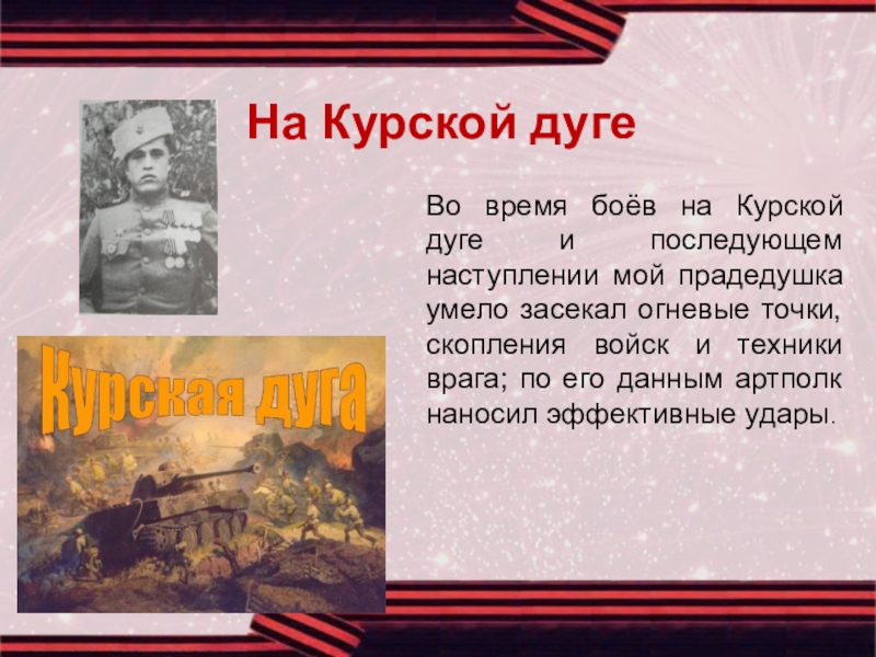 мой прадедушка умело засекал огневые точки, скопления войск и техники врага; по его данным артполк наносил эффективные удары.