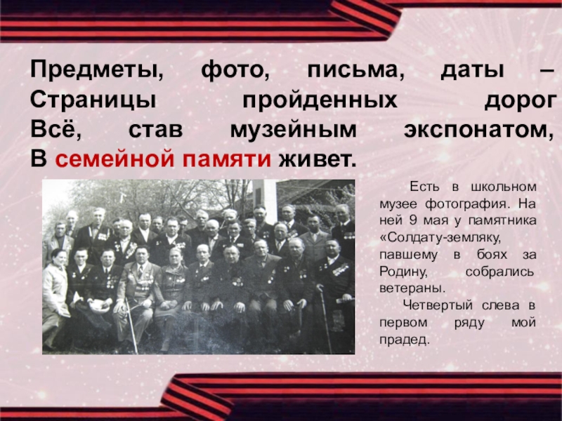 Есть в школьном музее фотография. На ней 9 мая у памятника «Солдату-земляку, павшему в боях за Родину, собрались ветераны.