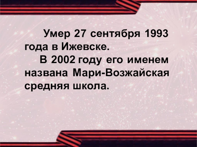 Слайд 23 Умер 27 сентября 1993 года в Ижевске.