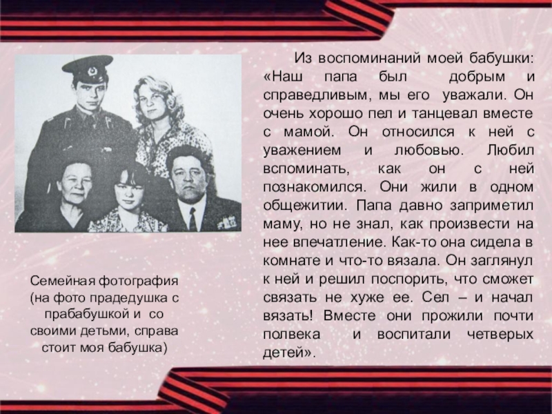 Из воспоминаний моей бабушки: «Наш папа был добрым и справедливым, мы его уважали. Он очень хорошо пел и танцевал вместе с мамой. Он относился к ней с уважением и любовью. Любил вспоминать, как он с ней познакомился. Они жили в одном общежитии. Папа давно заприметил маму, но не знал, как произвести на нее впечатление. Как-то она сидела в комнате и что-то вязала. Он заглянул к ней и решил поспорить, что сможет связать не хуже ее. Сел – и начал вязать! Вместе они прожили почти полвека и воспитали четверых детей».