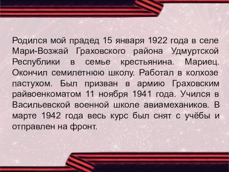Слайд 4Родился мой прадед 15 января 1922 года в селе Мари-Возжай Граховского