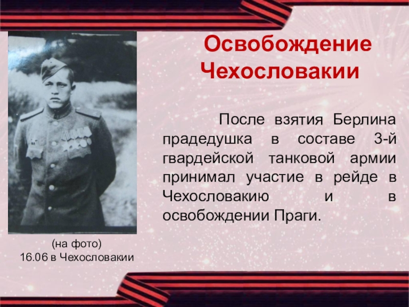 После взятия Берлина прадедушка в составе 3-й гвардейской танковой армии принимал участие в рейде в Чехословакию и в освобождении Праги.