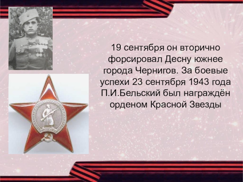 успехи 23 сентября 1943 года П.И.Бельский был награждён орденом Красной Звезды