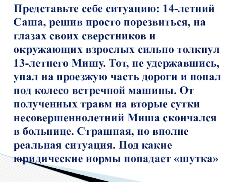 Слайд 11Представьте себе ситуацию: 14-летний Саша, решив просто порезвиться, на глазах своих