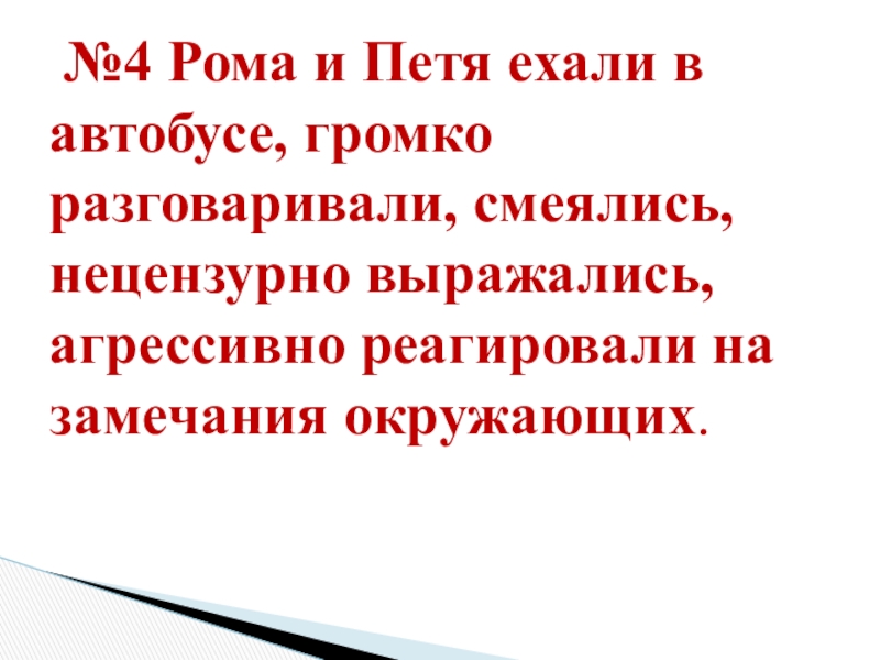 Слайд 33 №4 Рома и Петя ехали в автобусе, громко разговаривали, смеялись, нецензурно