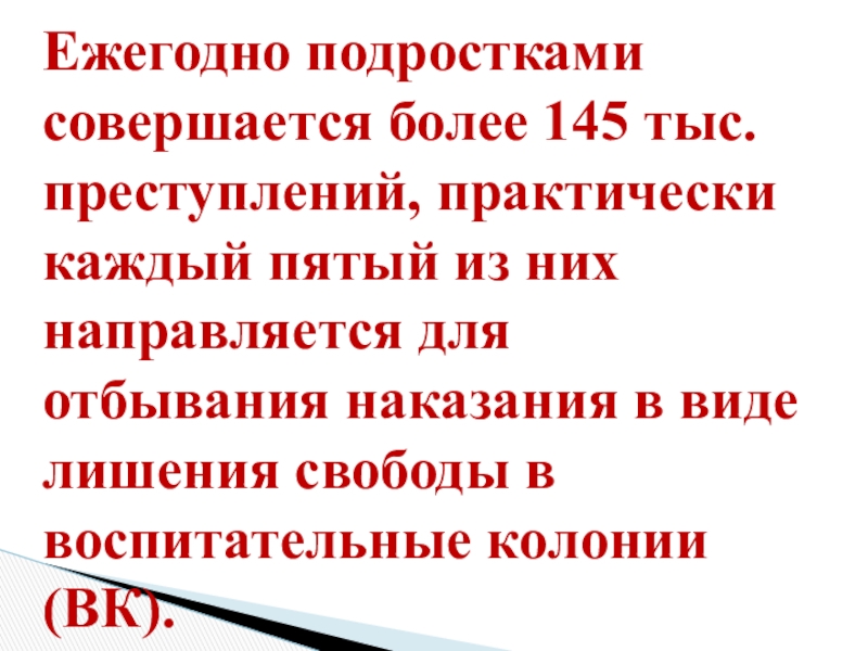 Слайд 4Ежегодно подростками совершается более 145 тыс. преступлений, практически каждый пятый из