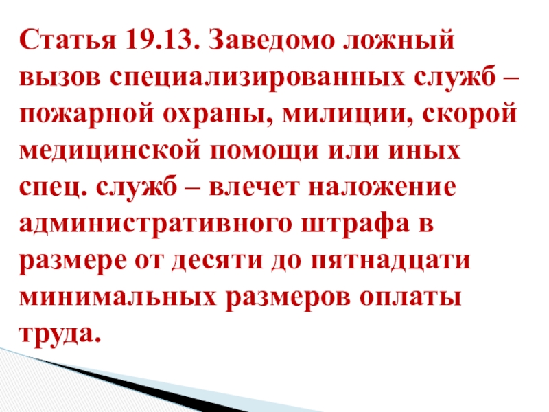 Слайд 25Статья 19.13. Заведомо ложный вызов специализированных служб – пожарной охраны, милиции,