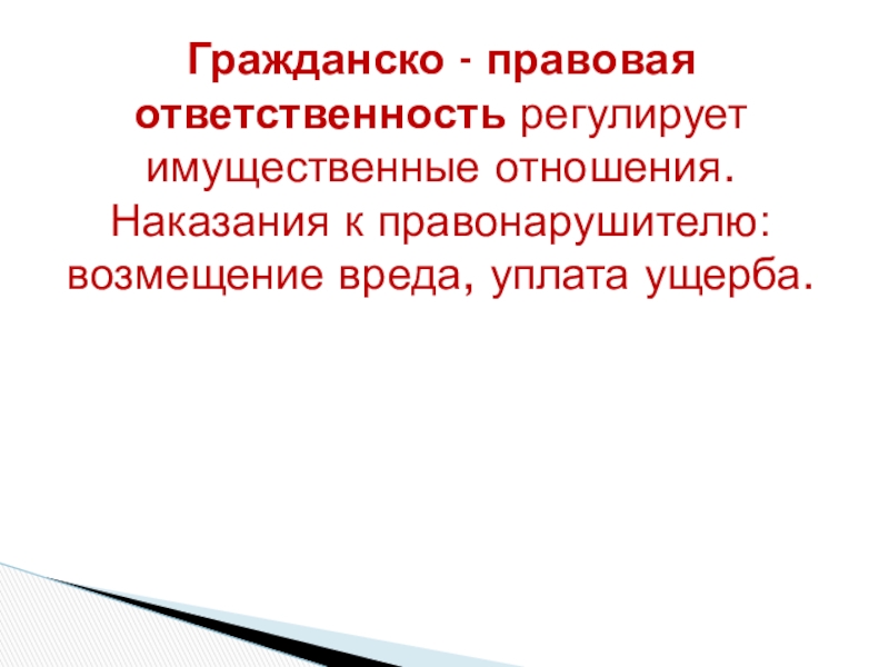 Слайд 35Гражданско - правовая ответственность регулирует имущественные отношения. Наказания к правонарушителю: возмещение