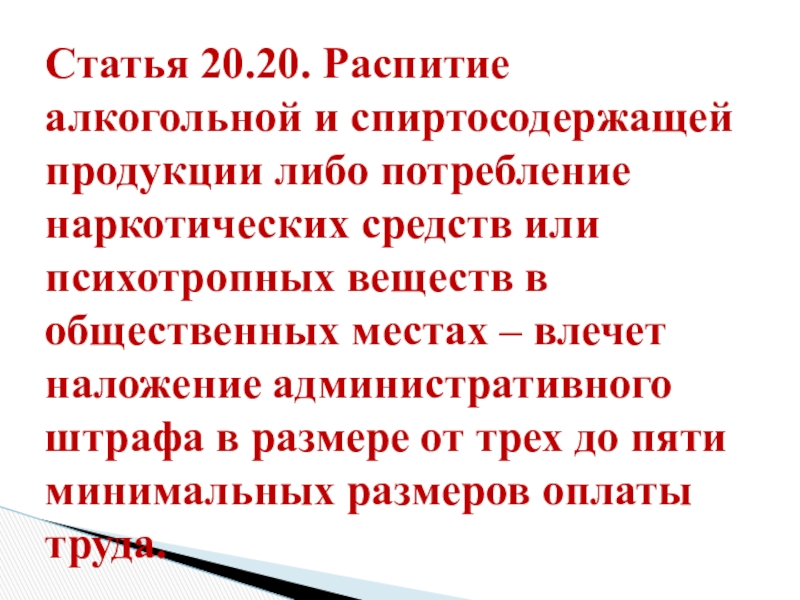 Слайд 27Статья 20.20. Распитие алкогольной и спиртосодержащей продукции либо потребление наркотических средств