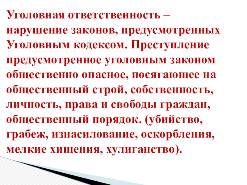Слайд 9Уголовная ответственность – нарушение законов, предусмотренных Уголовным кодексом. Преступление предусмотренное уголовным